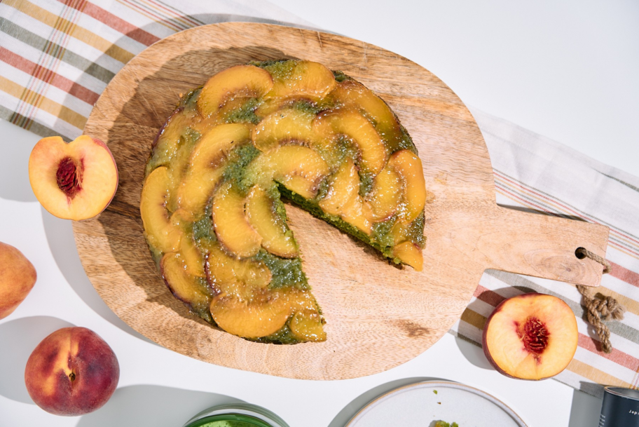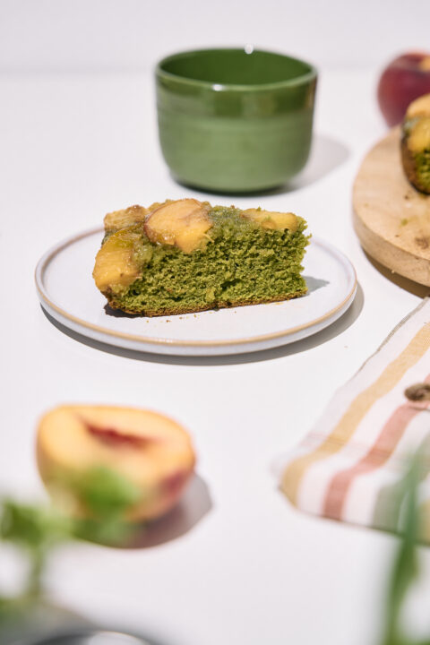 Au premier abord, ce gâteau peut paraître compliqué mais son goût et son apparence sont inégalables ! La douceur juteuse des pêches rencontre la légère amertume du matcha, créant un duo qui vous surprendra. Un biscuit aéré et parfumé, une rosace créée par les pêches et une note verte grâce au matcha… voici un dessert qui s’inscrit parfaitement dans cette fin d’été et qui ne laissera personne indifférent.