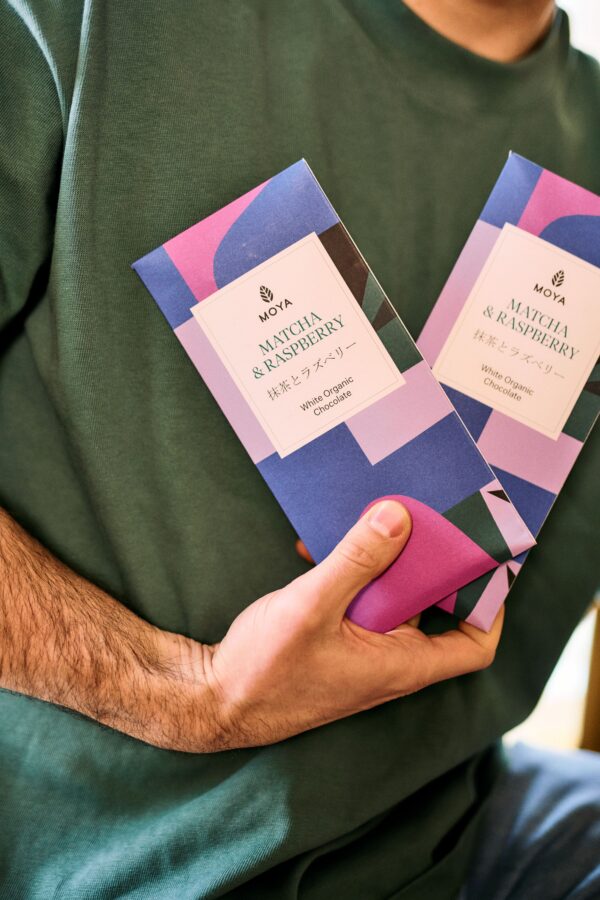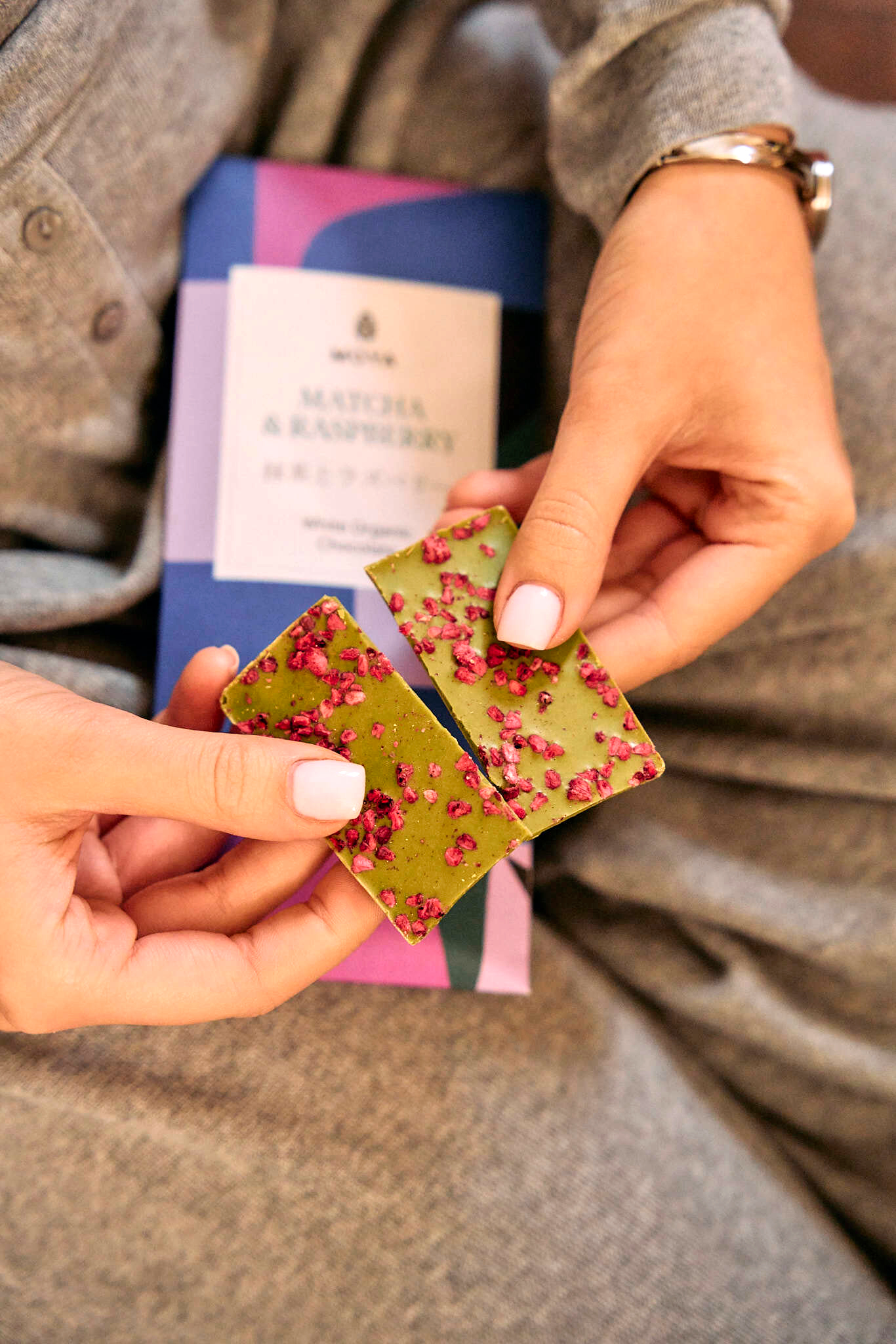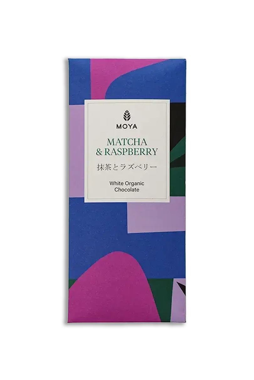 Ingrédients: Moya Matcha Daily (2,5 %), beurre de cacao, sucre, lait de vache écrémé en poudre, framboises lyophilisées (1 %), lécithine de soja sans OGM, cacao sec (mini-mum 40 %)