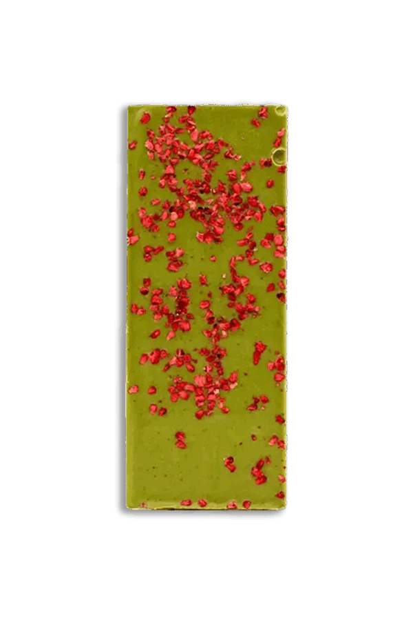 Les framboises des bois donnent à ce chocolat un arrière-goût fruité subtil, connu de ceux qui ont essayé notre fameuse recette de cheesecake au matcha.