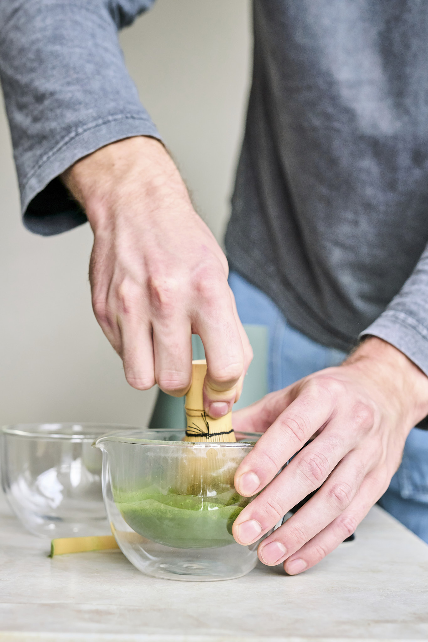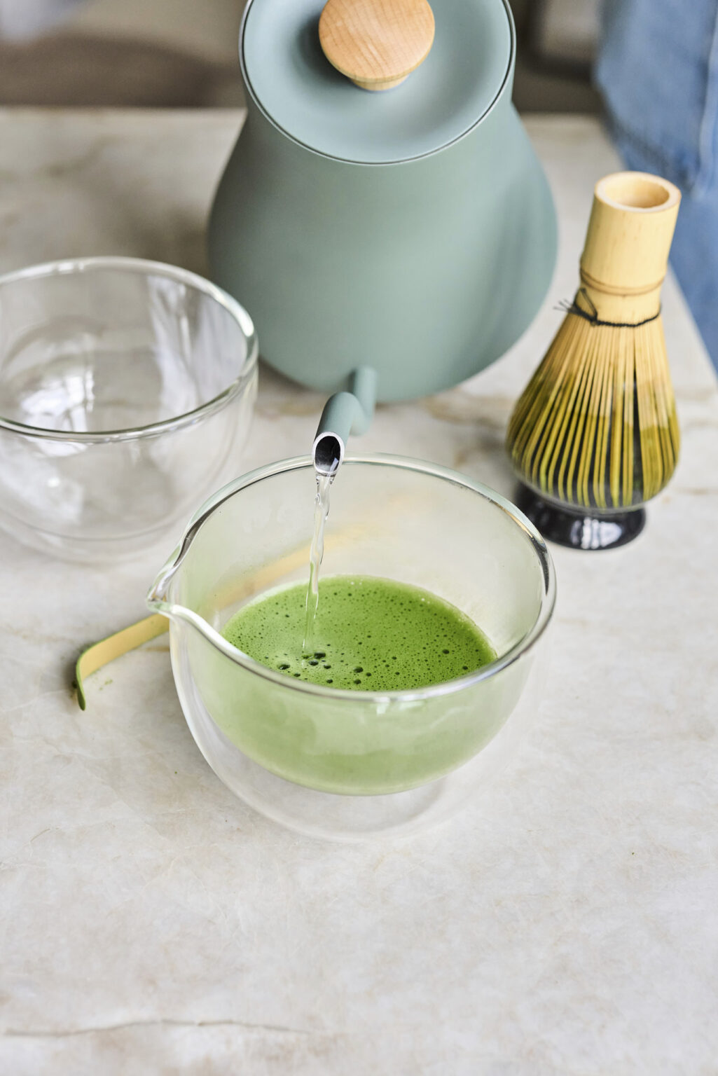 Il a été fabriqué à la main en verre borosilicaté. Ses parois verticales et son fond large permettent de diluer le matcha dans l’eau et d’obtenir rapidement une épaisse mousse verte à la surface.