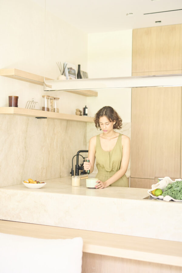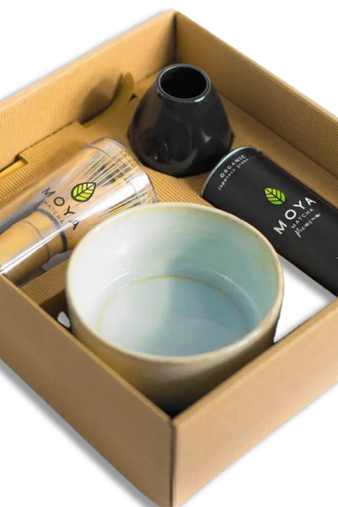Le matchawan, ce bol traditionnel utilisé lors de la cérémonie du thé japonaise, facilite beaucoup la préparation du matcha. Lorsque vous fouettez le matcha avec un fouet en bambou (le chasen), les hautes parois verticales du matchawan aident à empêcher l’eau de déborder. Le large fond du bol vous permet de fouetter facilement la poudre à l’intérieur et d’obtenir rapidement la mousse parfaite sur la surface. Pour préserver toutes les propriétés du matcha, veillez à utiliser l’eau ne dépassant pas les 80°C.