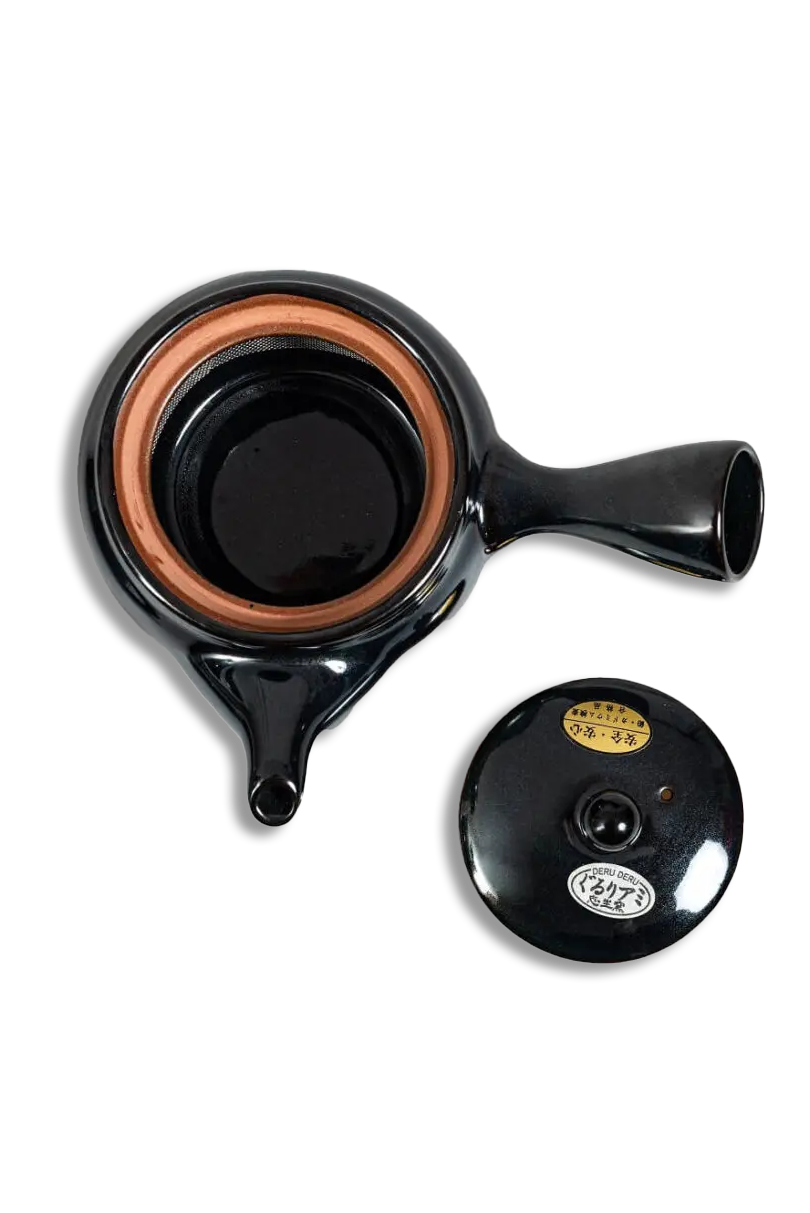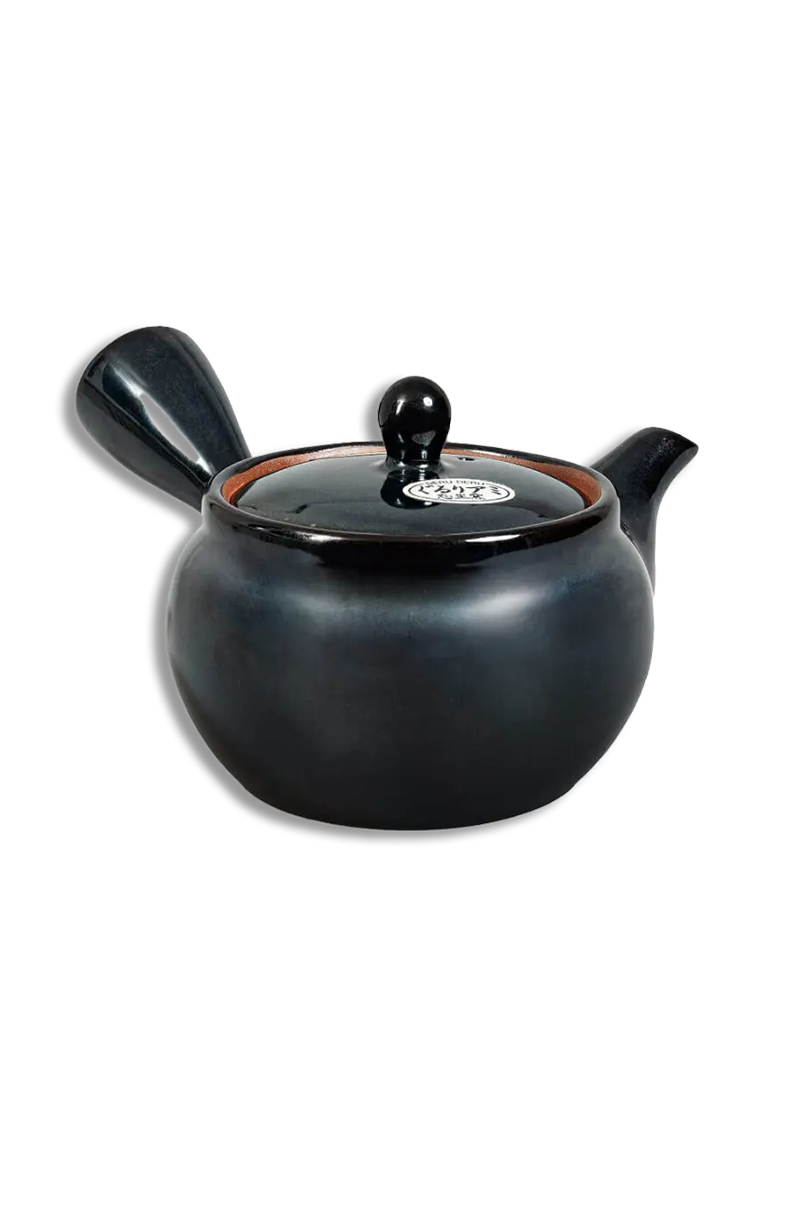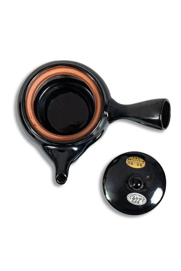 Le Kyusu Kuroshinju est une théière japonaise traditionnelle, munie d’une anse caractéristique sur le côté, qui sert à préparer du thé en feuilles. Le mot « kyusu » signifie littéralement « théière » ou « bouilloire », c’est pourquoi il désigne également d’autres récipients à thé que l’on peut trouver au Japon. Le Kyusu Kuroshinju est fabriqué en argile et se distingue par son émail brillant d’un noir profond, avec sur le côté, des nuances rousses de l’argile. À l’intérieur, elle est pourvue d’une passoire en métal qui retient les feuilles de thé.