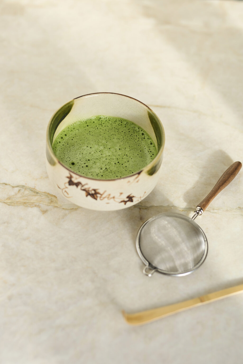La façon traditionnelle de préparer le matcha vient de la cérémonie du thé japonaise. Le bol à matcha, le fouet en bambou (chasen) et la spatule en bambou (chashaku) sont des éléments essentiels de ce rituel. Ajouter 2 chashaku de matcha (1,5 g) dans un bol à matcha et verser 100 ml d’eau chaude (80°C). Fouetter vigoureusement votre matcha avec le chasen. Le mouvement doit partir du poignet et former la lettre « M » (et non pas un cercle). Au bout 30 secondes environ, votre bol devrait être rempli d’une jolie mousse de couleur vert jade. Ensuite, vous pouvez ajouter plus d’eau si vous préférez que le matcha soit moins fort.