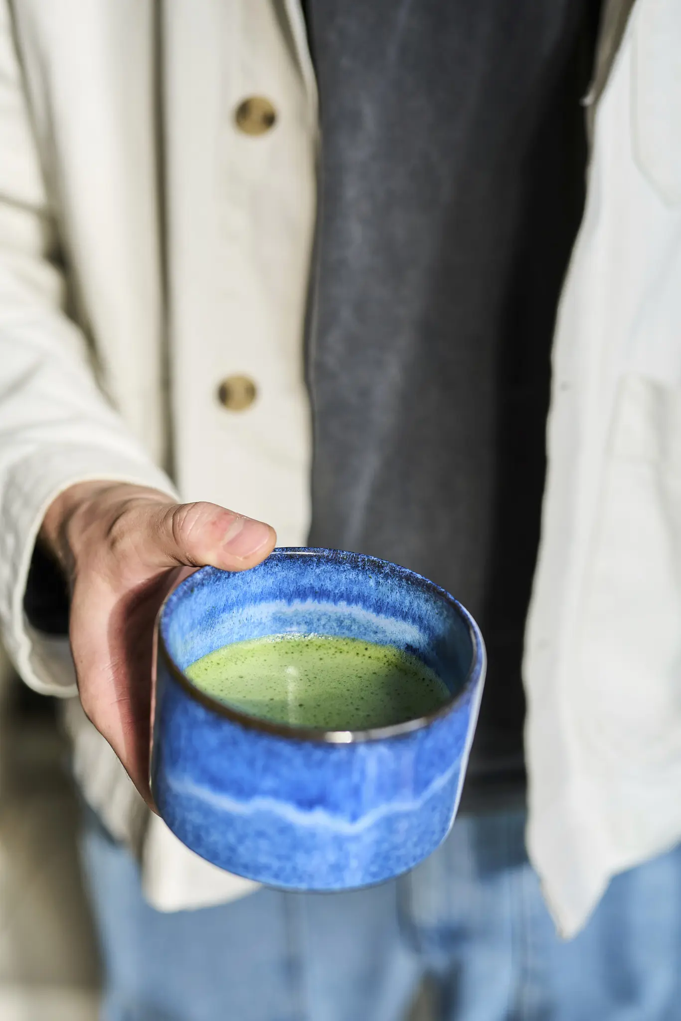 Le matchawan, ce bol traditionnel utilisé lors de la cérémonie du thé japonaise, facilite beaucoup la préparation du matcha. Lorsque vous fouettez le matcha avec un fouet en bambou (le chasen), les hautes parois verticales du matchawan aident à empêcher l’eau de déborder. Le large fond du bol vous permet de fouetter facilement la poudre à l’intérieur et d’obtenir rapidement la mousse parfaite sur la surface. Pour préserver toutes les propriétés du matcha, veillez à utiliser l’eau ne dépassant pas les 80°C.