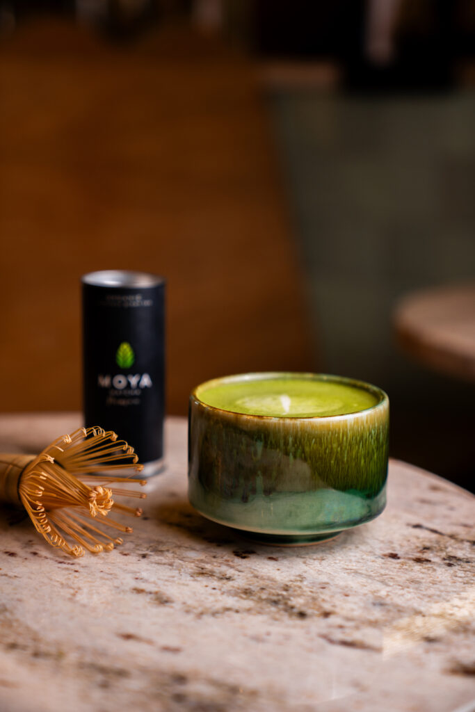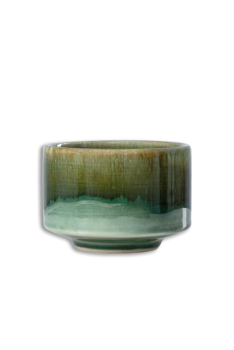 Le matchawan Mori est façonné à la main sur un tour de potier à partir d’argile naturelle et recouvert d’un émail vert profond inspiré des paysages forestiers. Sa teinte évoque la mousse humide, les feuilles et l’ombre des arbres. L’émail est élaboré selon une tradition japonaise pluriséculaire.