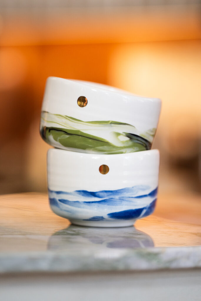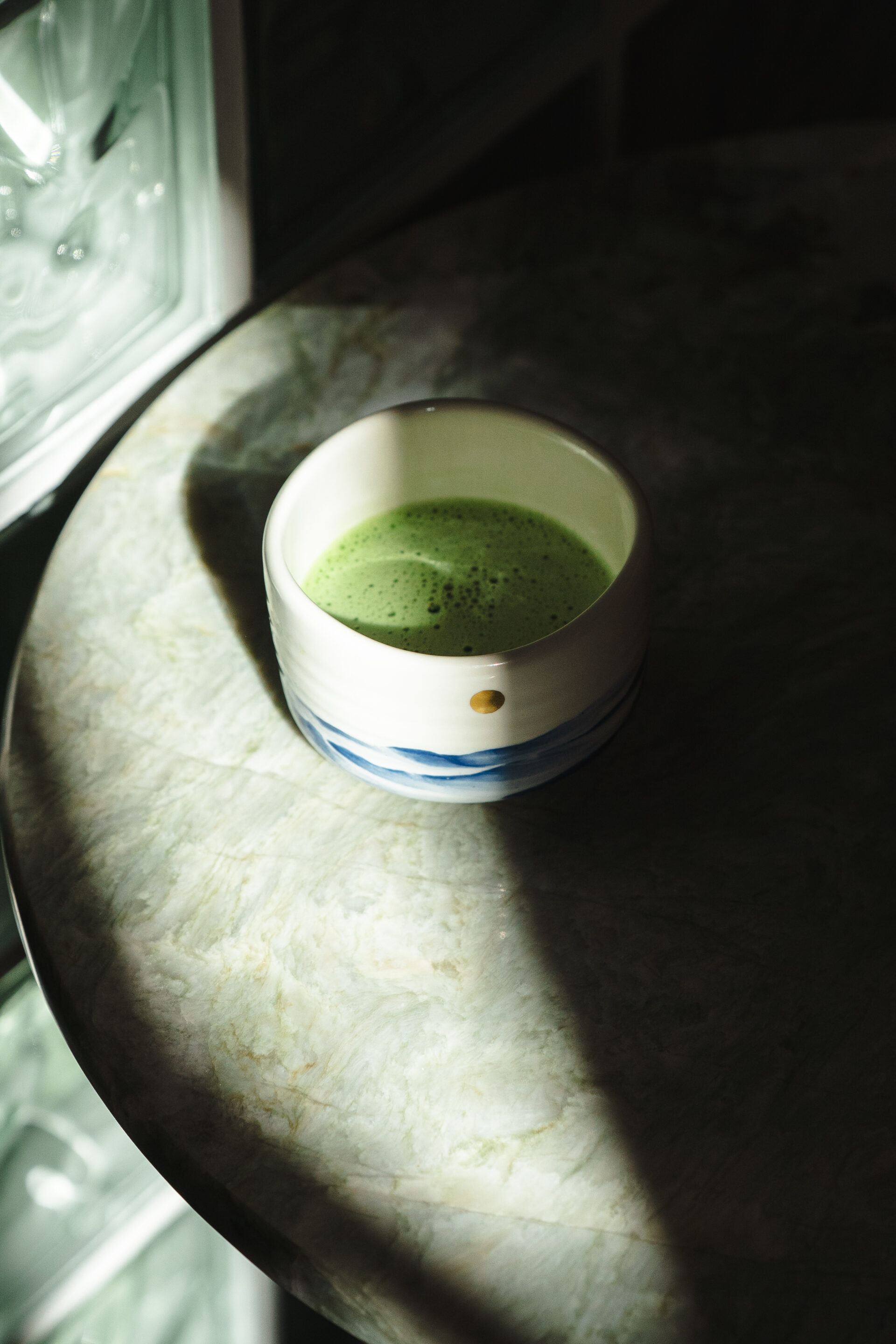Les bols de cette série sont décorés à la main – certains rehaussés de touches dorées – faisant de chaque pièce un objet véritablement unique. Leur forme permet de préparer le matcha avec facilité et d’obtenir une texture lisse et crémeuse.