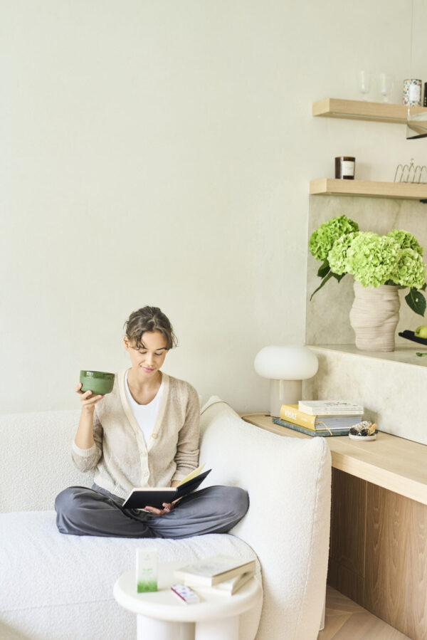 Fabriqué en porcelaine à partir d’une forme tournée à la main sur un tour de potier, le bol Matchawan Midorinami est utilisé pour servir le matcha. Il est inspiré des récipients traditionnels utilisés lors de Chanoyu, la cérémonie du thé japonaise. Ses parois basses et son large fond permettent de diluer le matcha dans l’eau de façon pratique et rapide et obtenir une belle mousse à la surface. Le meilleur outil pour créer cette mousse est le fouet « chasen » en bambou ou un mousseur à lait. Le Matchawan Midorinami a été conçu et réalisé par Quiet form, un studio de céramique basé à Kiev, fondé en 2016 par Alex et Tania, un couple amoureux des belles formes et des couleurs naturelles. La porcelaine qu’ils utilisent provient de l’est de l’Ukraine et leur glaçure certifiée vient d’Allemagne. Revêtant un beau vert profond, le bol Midorinami est doté d’une texture mate à l’extérieur et d’une glaçure brillante à l’intérieur.