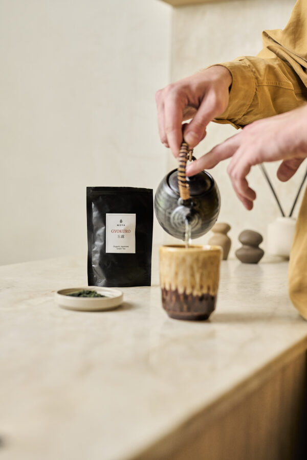 La méthode de culture du Moya Gyokuro est similaire à celle utilisée dans la production du matcha. Cependant, les feuilles de Gyokuro ne sont pas broyées en poudre, mais délicatement roulées dans des tubes ressemblant à des aiguilles. Grâce à un cette de technique de « mise à l’ombre » prolongée, les feuilles de thé prennent une couleur verte foncée pour se transformer ensuite en une infusion au goût multidimensionnel et profond. Le Moya Gyokuro est fabriqué dans de petits champs de thé de la région de Kagoshima, sur l’île de Kyushu, dans le sud du Japon.