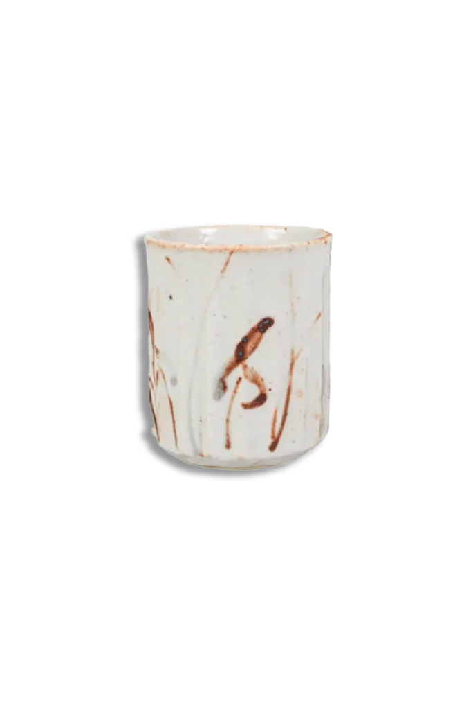 Ce mug à thé a été fabriqué au Japon sur l’île de Honshu, dans la ville de Toki, célèbre pour son école de poterie traditionnelle appelée Shino. Tout d’abord, le récipient a été façonné dans un moule. Ensuite, sa forme finale et ses motifs ont été réalisés à la main, c’est pourquoi tous les mugs sont légèrement différents.