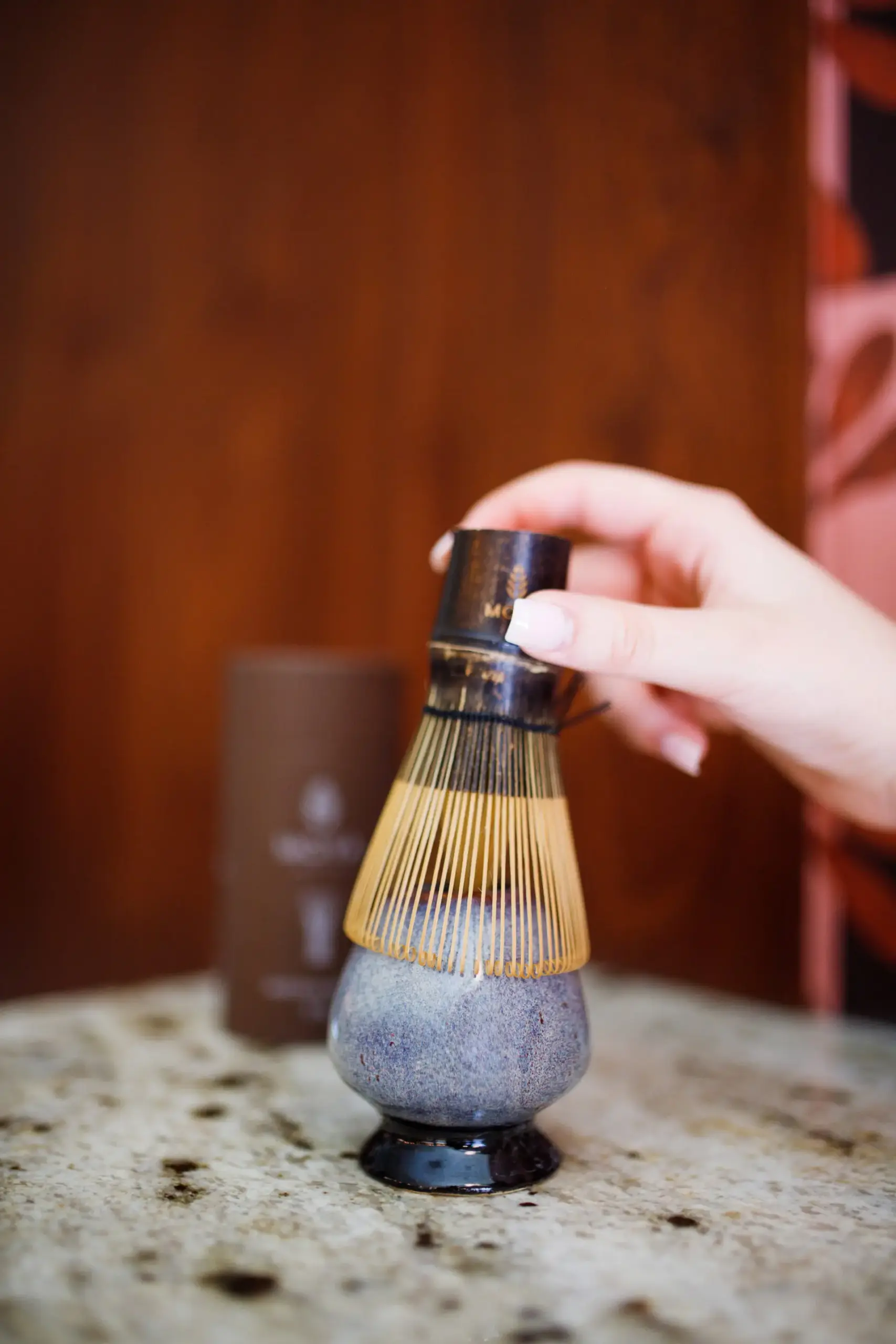 Le support pour fouet (chasen), appelé « naoshi » au Japon, est un élément indispensable du set de préparation du matcha de chaque amateur de ce thé. Fabriqué en porcelaine, le support aidera à garder les brins délicats de votre chasen en parfait état, sans déformations, pour une plus grande durabilité et longévité. Naoshi est un ustensile utilisé pour la cérémonie du thé traditionnelle japonaise depuis de nombreux siècles. Aujourd’hui, on le voit de plus en plus souvent dans les cuisines des personnes appréciant le matcha correctement préparé. Le chasen présenté sur la photo est vendu séparément.