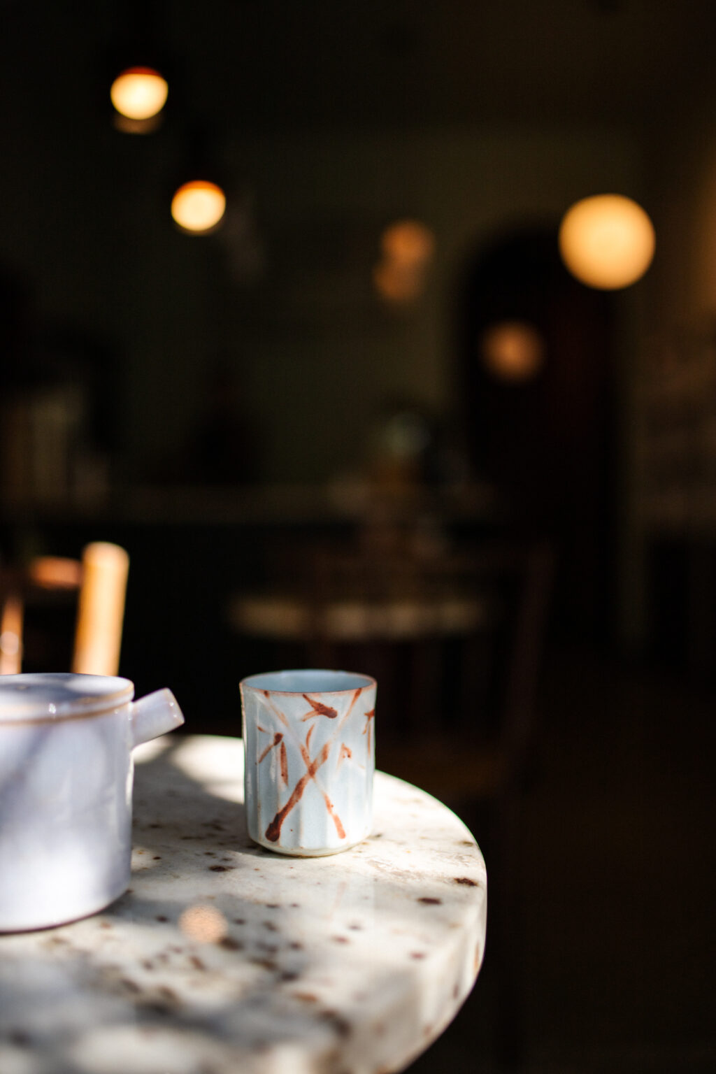 Ce mug à thé unique a été fabriqué selon les principes de l’école de poterie Shino de la ville de Toki située sur l’île japonaise de Honshu. C’est là que, depuis des années, on crée des céramiques dans le respect de la tradition japonaise du thé. Dans un premier temps, le récipient a été façonné dans un moule. Sa forme finale et ses motifs ont été ensuite faits à la main. Grâce à cela, chaque mug est unique.