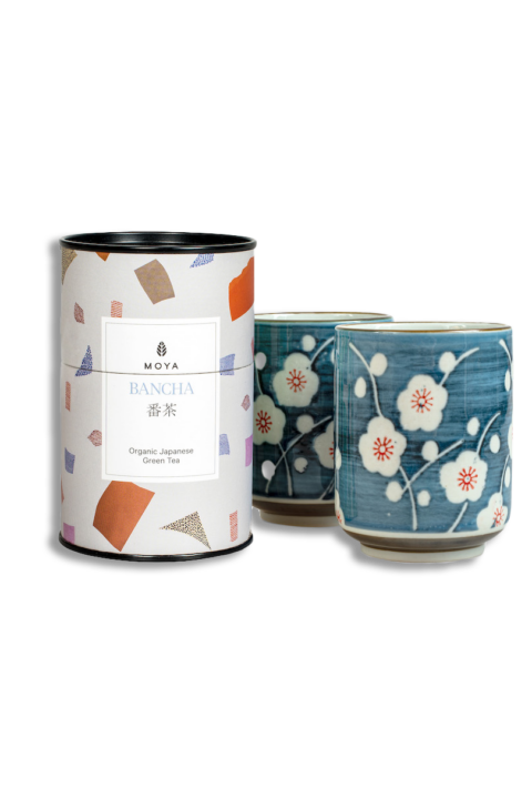 Thé en feuilles Moya de votre choix, présenté avec des tasses artisanales tournées à la main.