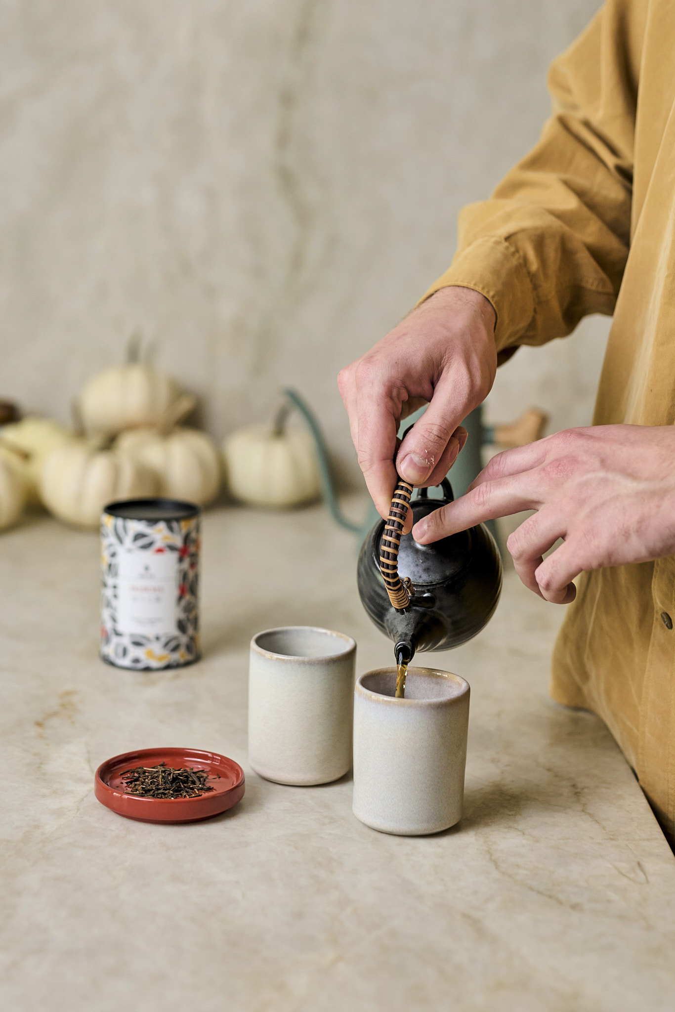 Thé en feuilles Moya de votre choix, présenté avec des tasses artisanales tournées à la main.