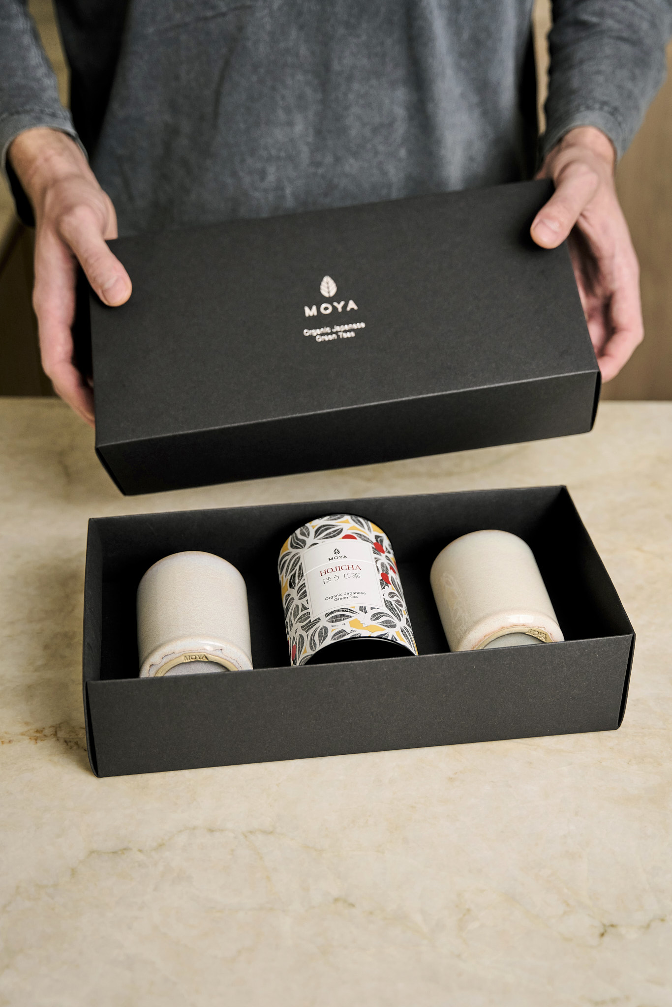 Emballage: Élégante boîte en carton noire avec le logo argenté de Moya.