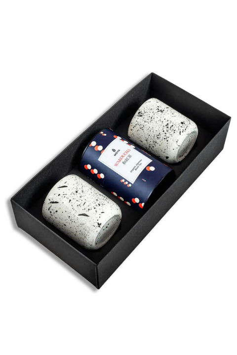 Le mug Shimo est un récipient unique destiné à la consommation de thé dans le cadre de la cérémonie traditionnelle du thé. Tous les mugs Shimo sont fabriqués en argile réfractaire selon un modèle fait à la main de façon à ce qu’ils aient tous la même forme. Une fois ces poteries cuites, elles sont décorées à la main, avec un pinceau, pour créer des petites taches irrégulières qui auront une apparence un peu différente sur chaque mug. Ensuite, les mugs sont recouverts d’un émail transparent et cuits à nouveau à 1160 degrés.