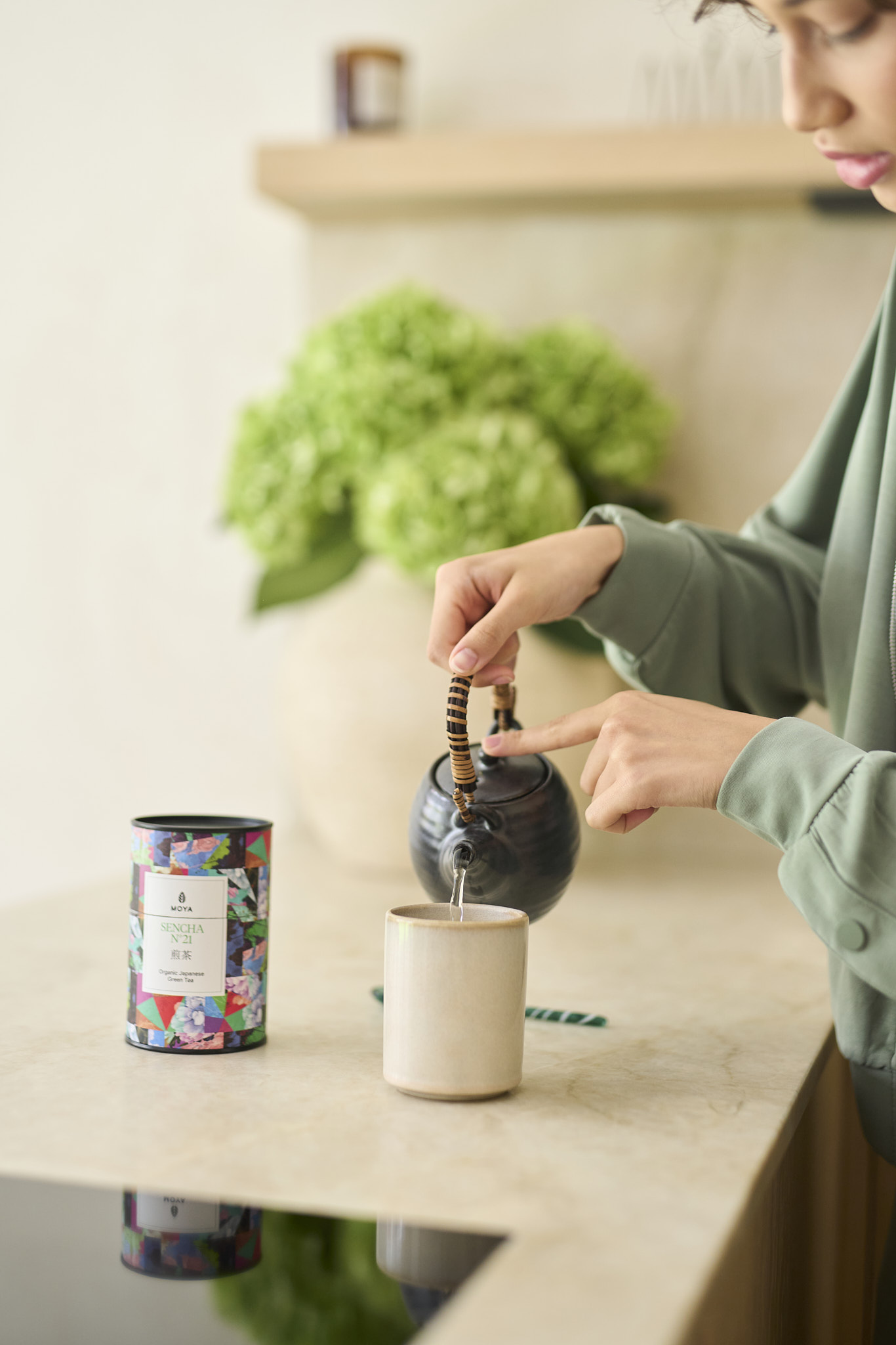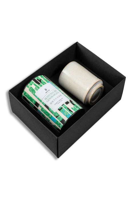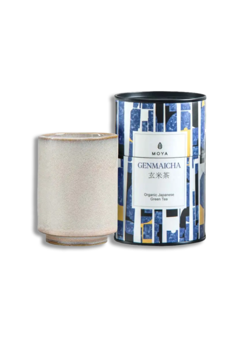 Thé en feuilles Moya de votre choix, présenté avec une tasse artisanale tournée à la main.
