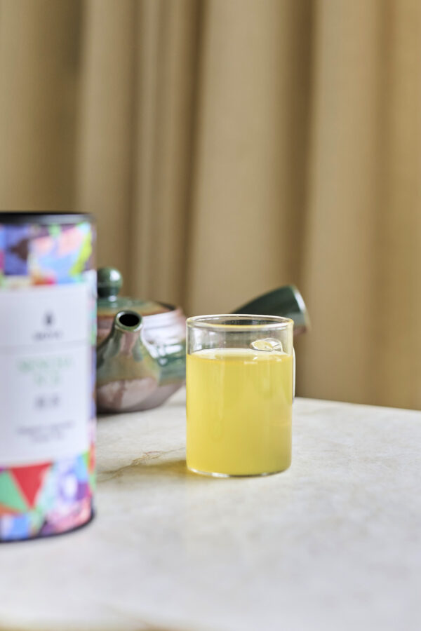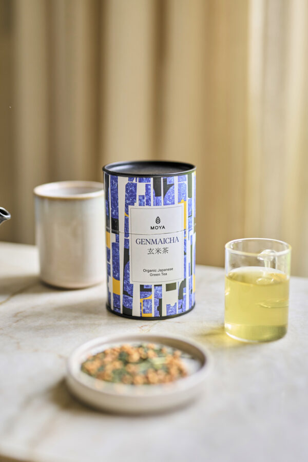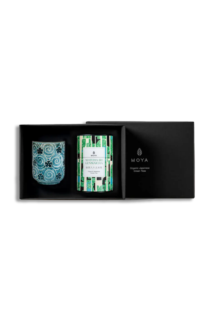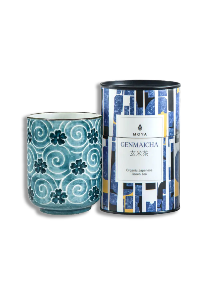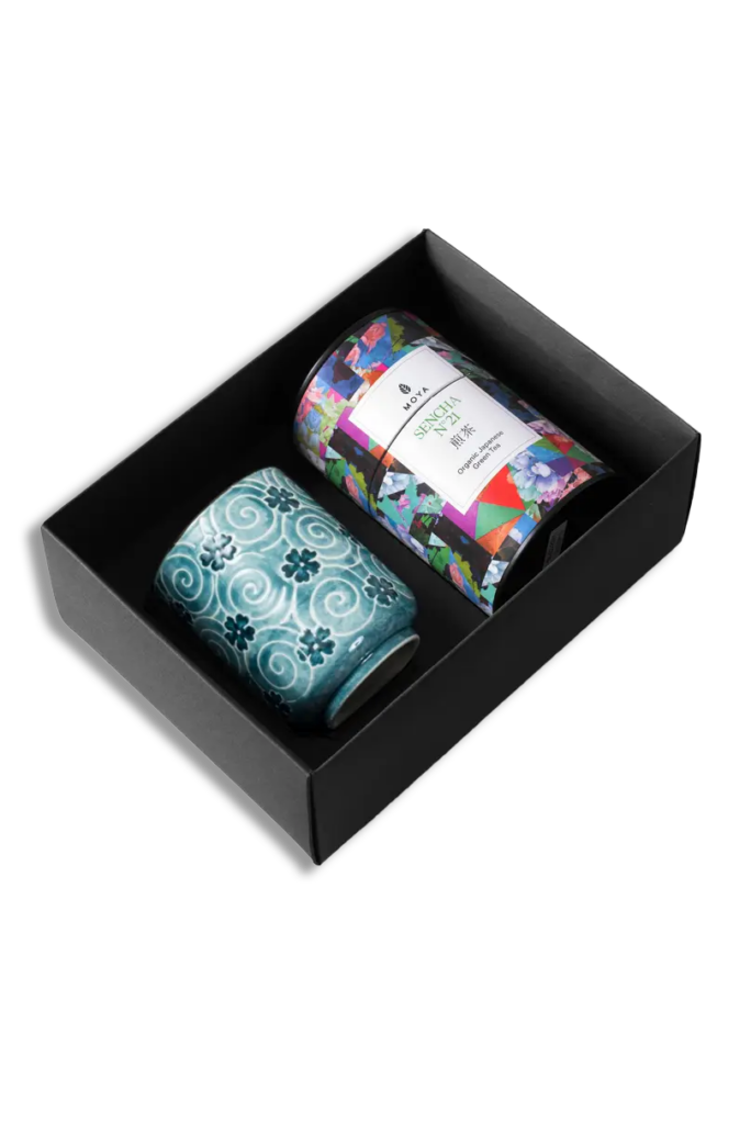 Thé en feuilles Moya de votre choix, présenté avec une tasse artisanale tournée à la main.