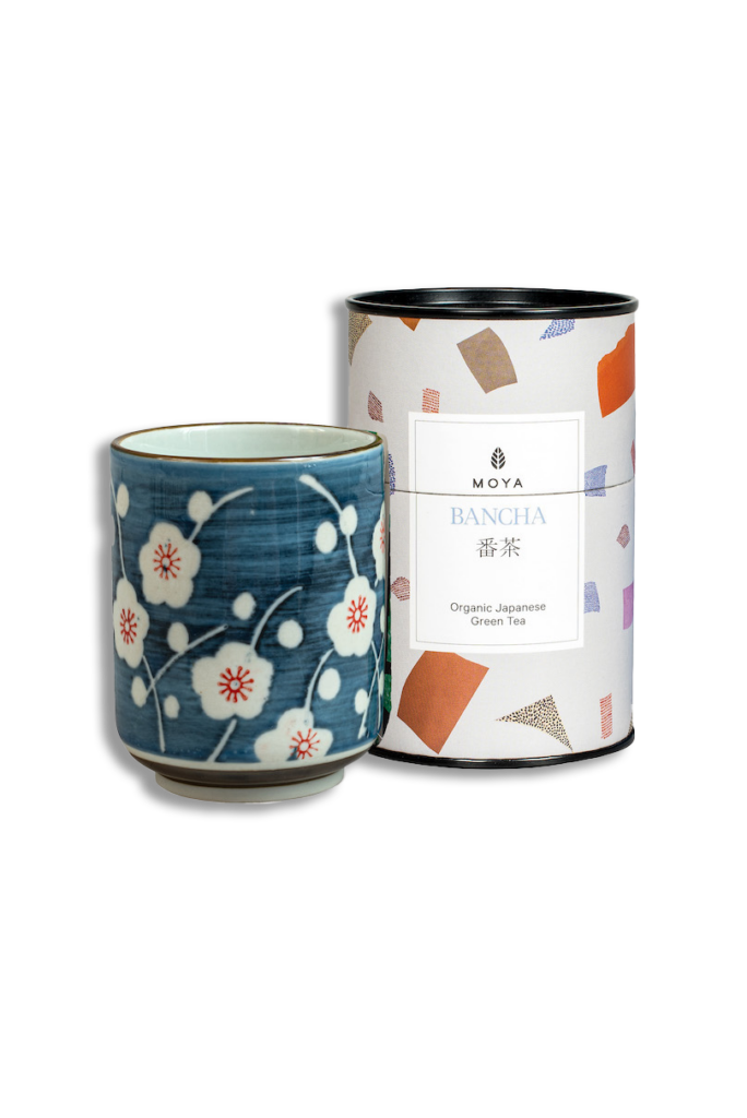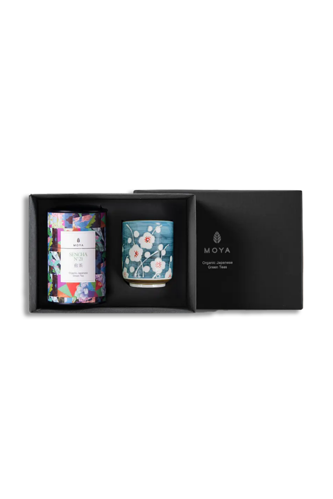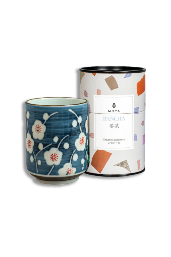 Thé en feuilles Moya de votre choix, présenté avec une tasse artisanale tournée à la main.