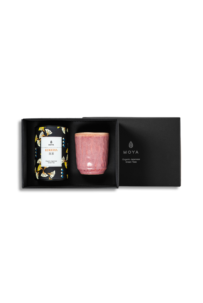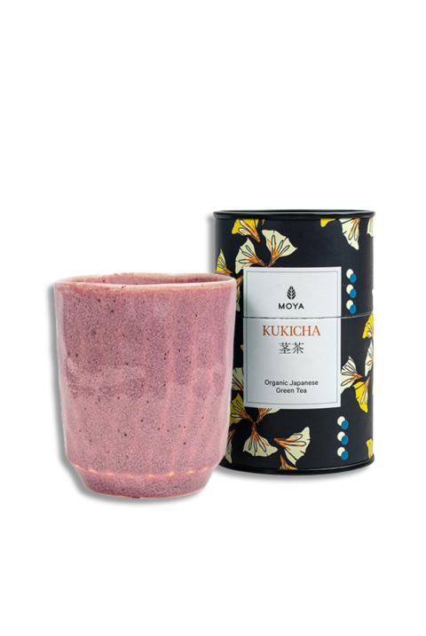 Thé en feuilles Moya de votre choix, présenté avec une tasse artisanale tournée à la main.