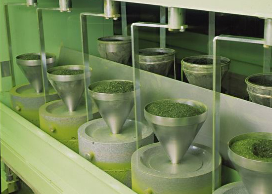 Pour obtenir le matcha, les feuilles du tencha sont broyées dans une meule à grains. Deux pierres spécialement profilées tournent lentement, en réduisant le thé en poudre. Le processus exige beaucoup de temps et de précision : chaque meule est capable de produire seulement 40 grammes de thé par heure. En conséquence, le thé ainsi obtenu est si fin qu’il s’incruste entre les plis digitales. Grâce à sa structure en poudre, il se mélange idéalement avec l’eau, en donnant l’impression d’être soluble (comme par exemple le cacao). Ainsi préparé et servi dans un bol, le thé matcha a une consistance parfaitement homogène et crémeuse.
