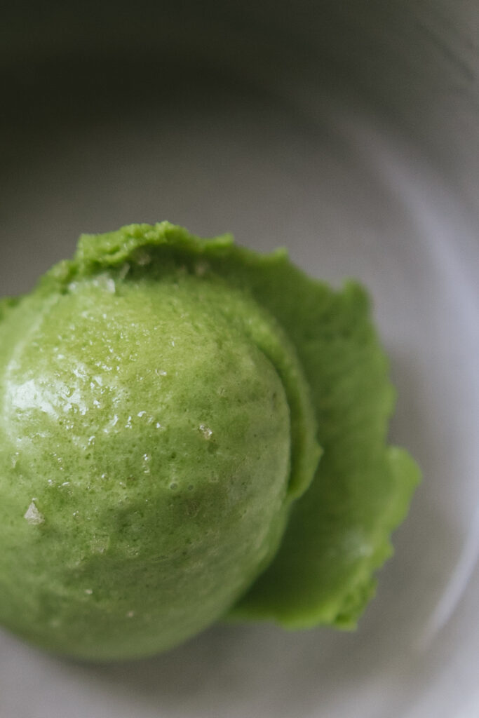 Tamiser le matcha avec l’amidon, verser dans un saladier et fouetter avec un peu de lait de coco jusqu’à l’obtention d’une masse homogène. Ajouter la masse obtenue dans le saladier, en incorporant le lait restant, le sucre, le sirop d’érable, l’extrait de vanille et la pincée de sel. Mélanger le tout jusqu’à dissolution du sucre. Goûter le mélange : il doit avoir un goût intense de matcha et être un peu trop sucré (après congélation, la douceur est beaucoup moins perceptible). Verser dans le bol réfrigéré de la sorbetière et suivre les instructions du fabricant. Transvaser la masse congelée dans une boîte à glace et mettre au congélateur pour quelques heures de plus.